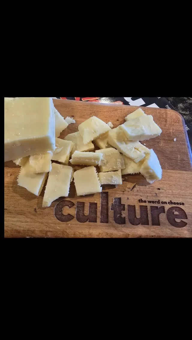 The curds are cheddared and then aged for a minimum of 9 months.